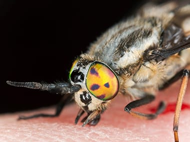 Male and female deer and horse flies feed on plant pollen and nectar, but the females also require blood meals in order to get the protein they need to make their eggs. Bites from these flies are painful and leave behind large, red, itchy welts. Females find their prey by sensing body odor and the presence of carbon dioxide.